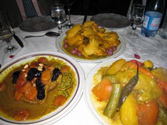 4.モロッコは、イスラムの王国であるが、「ソフト・イスラム」と呼ばれるとおり、規律はそれほど厳しくなく、お店でもお酒が飲める。料理は、「クスクス」を主食に、野菜や鶏、羊がそのままに近い形で出てくる。ビールやワインもなかなかいける。