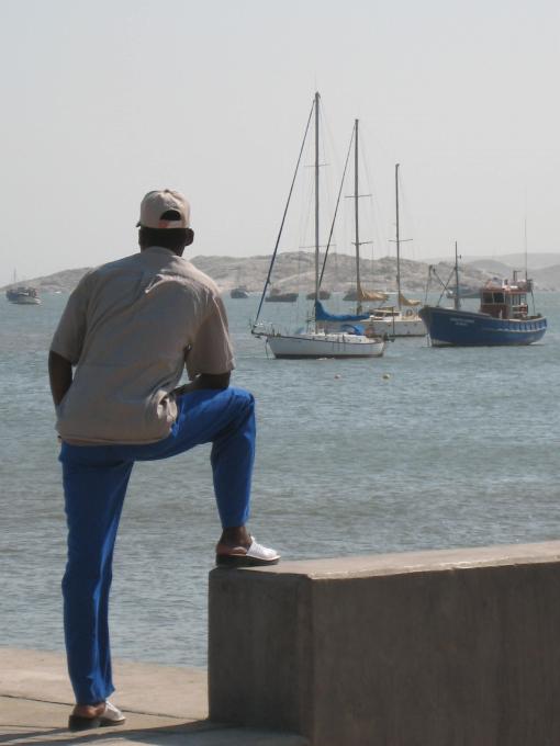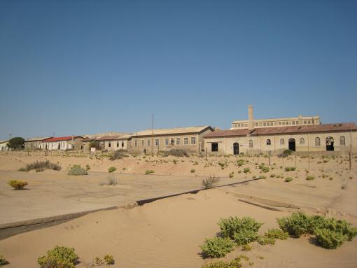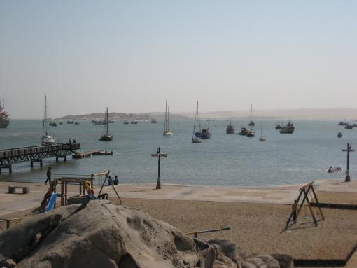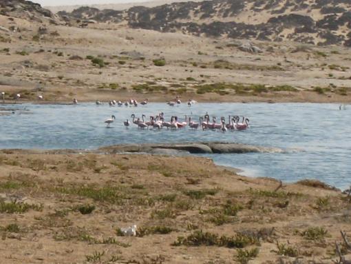 3.約15分でリューデリッツの街(港)に着く。亜鉛やダイヤモンドの積み出し港となっているリューデリッツの街は、美しい港町である。港にたたずむ人も多く、しゃれたカフェもある。なかなかいい景色である。たった20分ほどの滞在はもったいないくらいであったが、さらに、一般には立ち入り禁止となっているダイヤモンド発掘地域も連れていってもらった。さすがに現場は見せてもらえないが、砂から取り出すそうである。しかし幸運なことに、近くの池でフラミンゴの集団と出会った。私にとって、自然のフラミンゴは1992年のタンザニアのンゴロンゴロ国立公園以来である。遠くからではあるがとても美しい。霧のおかげでラッキーなツアーを楽しめた。霧が晴れたとの連絡があり、2時間の遅れで再びスコーピオン鉱山に向かった。