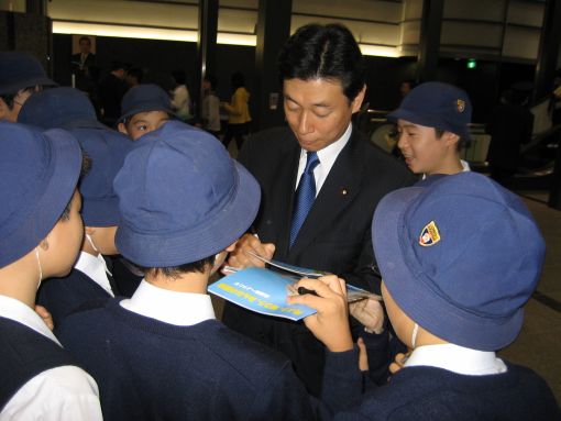 3.午前9時過ぎには、長女のクラスの国会見学を手伝い、国会の仕事の説明をする。すると、長女の友達からサインを求められ照れながらも応じる(写真②)。チラっと見ると長女の侑子がニコニコしている。私は、自慢の父なのだろうか(笑)