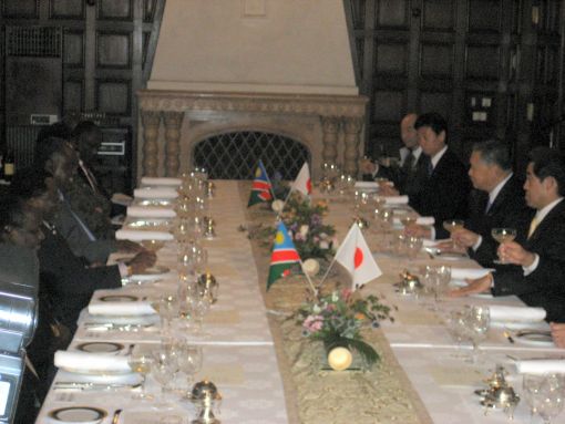 4.11時半からは、森喜朗・日本アフリカ議員連盟会長、逢沢一郎・同幹事長のお伴をして、ポハンバ・ナミビア大統領を歓迎する昼食会である(写真③)。私は、ナミビア担当副委員長として8月にナミビア訪問したところであり、大統領からの「日本からの投資、農業支援・水不足対策などお願いしたい。」との要請に、「日本は資源開発だけでなく、農業指導の専門家の派遣、農産品の販売促進など総合的に協力できる」旨申し上げた。ハウシク外務大臣からは「次回来るときには是非声をかけてほしい」と言われた。