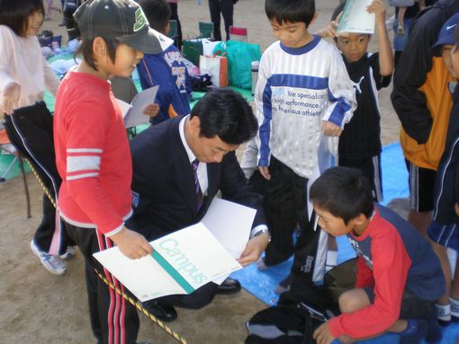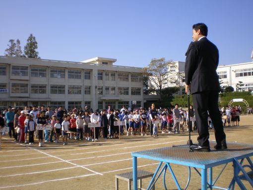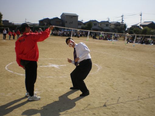 明石・谷八木小学校区住民運動会で、パン食い競争。最後まで手を使わずに「公正な(クリーンな)」戦いぶり。ビリでした。