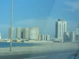 左の4棟は黒川紀章氏設計のビル、中央は私たちが泊まったホテル。右は日本企業も入るオフィス・ビル。地中海の水はきれいです。